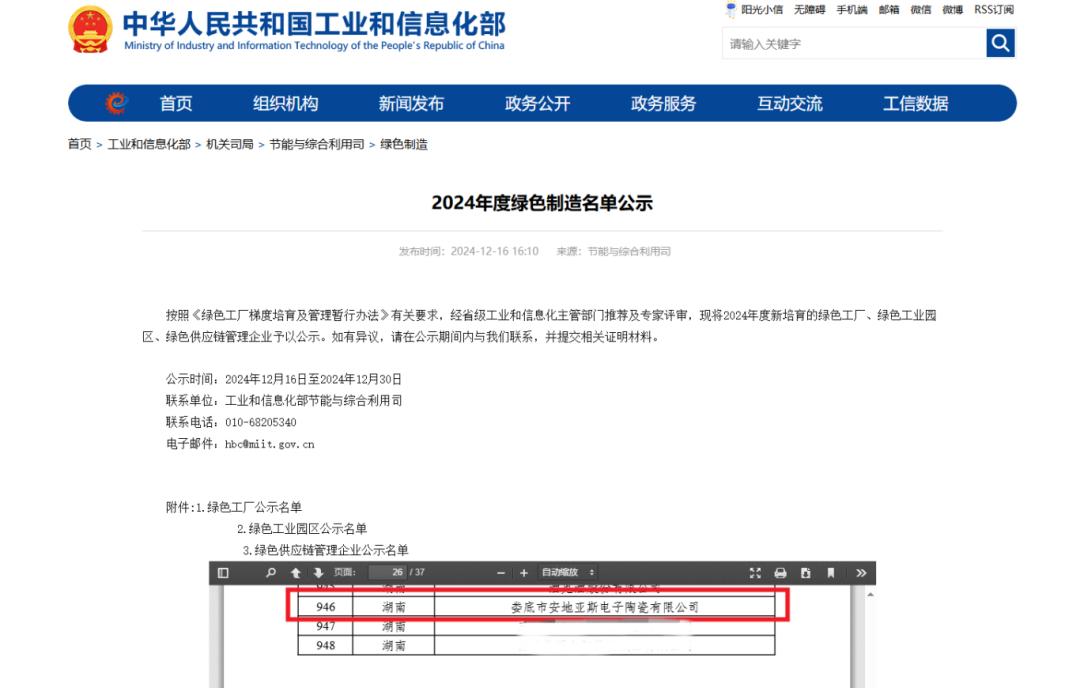 在可持續(xù)發(fā)展浪潮澎湃的當(dāng)下,工業(yè)領(lǐng)域的綠色轉(zhuǎn)型成為時(shí)代的必答題。近日,工業(yè)和信息化部公布了《2024年度綠色制造名單》,安地亞斯憑借在綠色制造領(lǐng)域的卓越表現(xiàn),榮獲“國(guó)家級(jí)綠色工廠”稱(chēng)號(hào),此榮譽(yù)是公司在綠色制造領(lǐng)域首創(chuàng)突破,更是為電子陶瓷行業(yè)樹(shù)立了新標(biāo)桿。